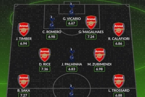 后卫:廷伯(阿森纳)、罗梅罗(热刺)、加布里埃尔(阿森纳)、卡拉菲奥里(阿森纳)
