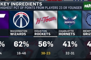 火箭主场迎战开拓者,转播方晒出本赛季23岁及以下球员得分占球队总分比重最高的五支球队,分别是: