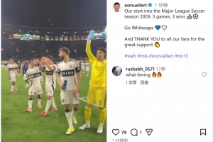温哥华白浪本赛季美职联开局取得3连胜,穆勒社媒庆祝胜利:“我们2026赛季的美职联开局——3战3胜,加油温哥华白浪!感谢所有球迷的大力支持。”