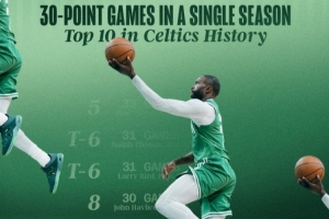 据统计,这是他本赛季第28次得分30+,闯进凯尔特人队史单赛季30+场次前十,追平塔图姆上赛季和2021-22赛季的纪录。