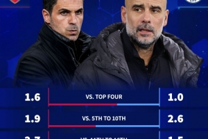体育资讯2月25日讯 在多赛一场的情况下,英超领头羊阿森纳目前仅领先位居次席的曼城5分。如今,英超冠军之中越来越激烈。德国转会市场盘点了两队面对其他英超球队时的积分情况。