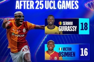 数据统计显示,奥斯梅恩(尼日利亚)在25场欧冠后打进16球,也超越了蓝军传奇德罗巴(科特迪瓦)的同期数据(15球),在非洲球员中仅次于18球的吉拉西(几内亚)。
