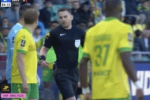 在上周末的第30轮法甲联赛,南特主场1-1战平布雷斯特。比赛第60分钟,布雷斯特长传发起进攻,南特球员塔比布在禁区外对布雷斯特球员卢克·佐格贝犯规。主裁判纪尧姆·帕拉迪斯先是向塔比布出示黄牌,但之后VAR介入,主裁判到场边观看视频回放后,改判塔比布红牌罚下。而南特主帅哈利霍季奇也因为抗议这次改判吃到红牌。